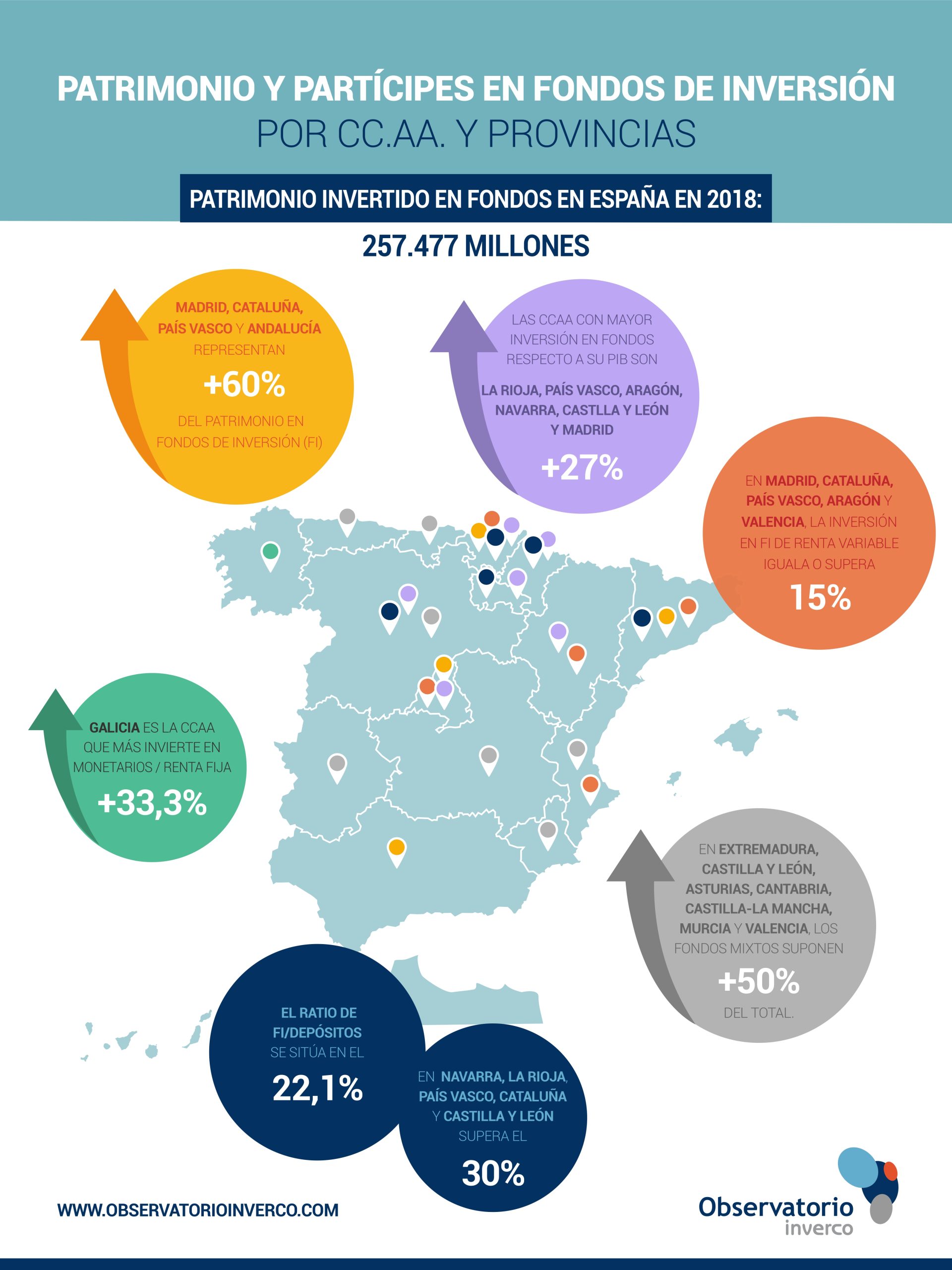 El volumen de activos de los Fondos de Inversión a nivel nacional supone el 21,3% del PIB (22,5% en 2017). La Rioja, País Vasco, Aragón, Navarra, Castilla y León, Madrid y Cantabria están por encima de la media nacional.
